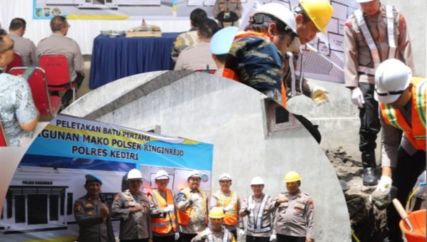 Cybertv.id-KEDIRI — Pembangunan kantor Polsek Ringinrejo Polres Kediri resmi dimulai. Kapolres Kediri AKBP Bramastyo Priaji, S.H., S.I.K., M.Si. melaksanakan peletakan batu pertama