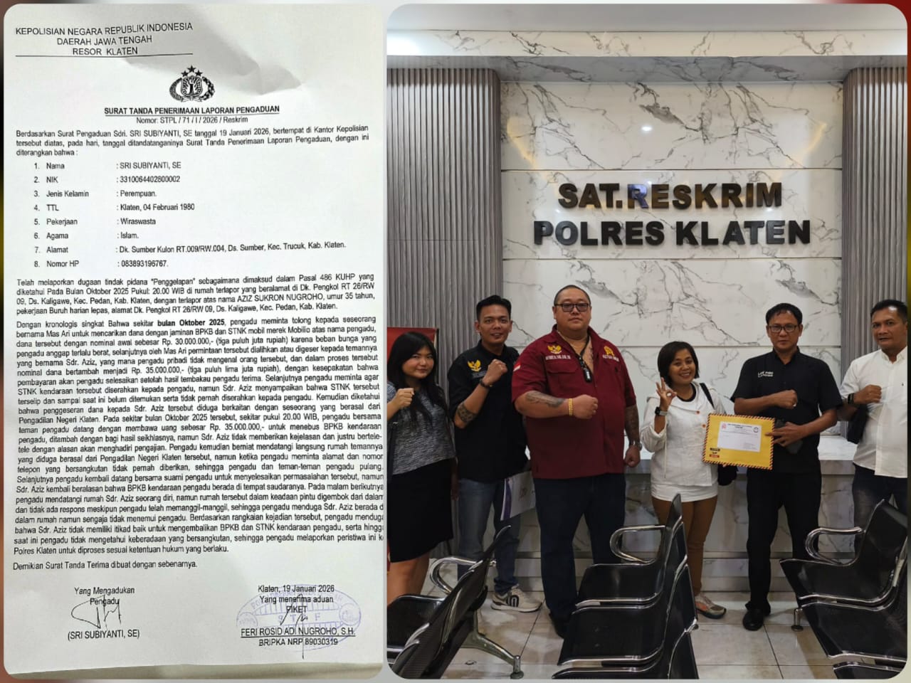 Kehadiran kami diterima dengan baik di Piket Reskrim Polres Klaten dan setelah tim HUKUM menyerahkan berkas aduan, berkas alat bukti awal, serta surat kuasa, dan setelah diperiksa sebentar Korban, aduan ditrima dengan baik dan diterbitkan tanda terima aduan oleh Polres Klaten dengan Nomor: STPL/71/I/2026/ResKrim ditandatangani Piket Reskrim Bripka Feri Rosid Adi Nugroho SH, NRP. 89030319.