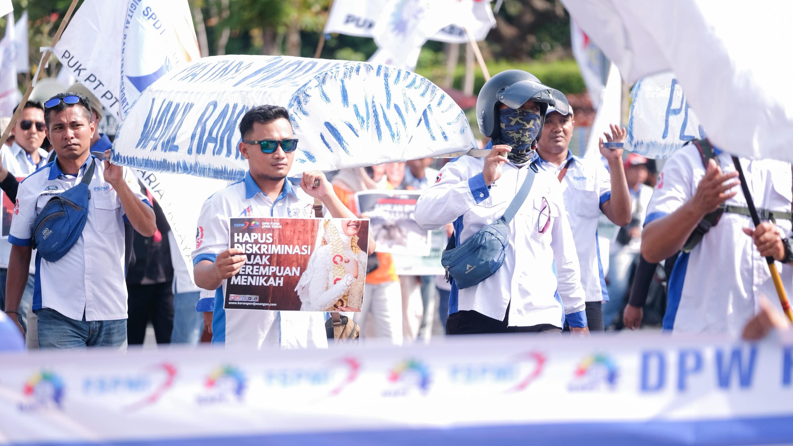 Massa buruh dari berbagai serikat pekerja mulai berkumpul sejak pagi di beberapa titik, seperti Bundaran Waru Sidoarjo, lalu bergerak menuju Gedung Negara Grahadi.