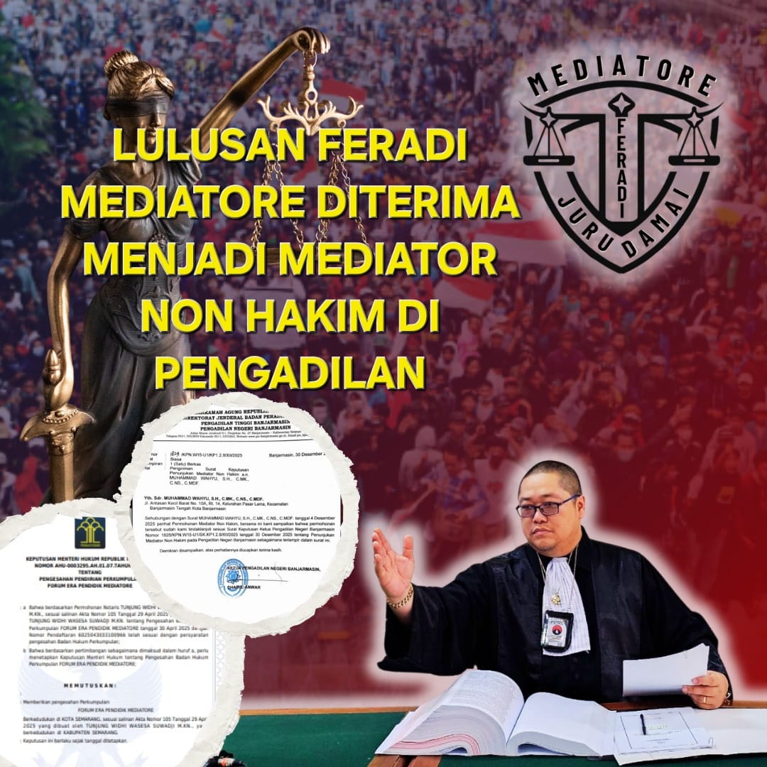 FERADI MEDIATORE sendiri merupakan lembaga sah berdasarkan SK Kemenkumham RI Nomor AHU-0003295.AH.01.07.TAHUN 2025. Keberhasilan Adv. Muhammad Wahyu, S.H., C.MDF. yang menempuh pendidikan pada November 2025 dan langsung terserap sebagai praktisi di PN Banjarmasin diharapkan menjadi inspirasi bagi profesional hukum lainnya untuk meningkatkan kompetensi di bidang Alternative Dispute Resolution (ADR).