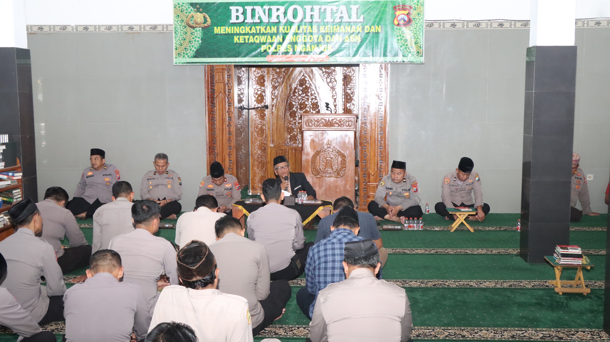 Cybertv.id-Nganjuk – Wakapolres Nganjuk KOMPOL Andria Diana Putra, S.E., M.H. memimpin kegiatan Pembinaan Rohani dan Mental (Binrohtal) Polres Nganjuk yang digelar di Masjid Al-Ikhlas Polres Nganjuk, dengan menghadirkan penceramah Ulama Kamtibmas Polsek Ngluyu KH. Achmad Khusairi, Kamis (18/12/2025).