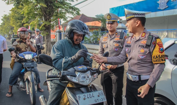 Aksi simpatik ini menyasar pengendara roda dua yang telah mematuhi aturan, khususnya dalam penggunaan helm dan kelengkapan surat-surat kendaraan, Rabu (23/7/2025)