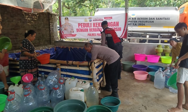 Dampak Kekeringan Polres Pasuruan Salurkan Bantuan Air Bersih 5000 liter untuk Warga Pasrepan