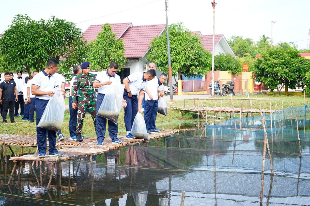 Kegiatan ini dipimpin langsung oleh Komandan Kodaeral XII, Laksamana Muda TNI Sawa, S.E., M.M., CIQaR., yang secara simbolis melepas 10.000 ekor benih ikan lele sebagai wujud nyata dukungan terhadap program pemerintah dalam memperkuat ketahanan pangan nasional.
