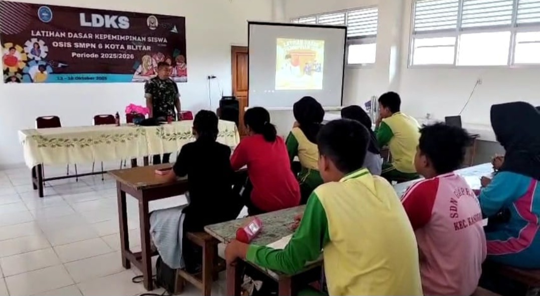 Cybertv.id – Blitar – Dalam rangka membentuk karakter disiplin dan jiwa kepemimpinan generasi muda, Danramil 0808/20 Sananwetan Kapten Inf Dwi Hariyanto memberikan materi wawasan kebangsaan dan bela negara kepada peserta Latihan Dasar Kepemimpinan Siswa (LDKS) OSIS SMPN 6 Kota Blitar tahun ajaran 2025/2026. Kegiatan ini berlangsung di halaman SMPN 6 Kota Blitar Jl. Pemuda Sumpono No. 73 Kelurahan Gedog Kecamatan Sananwetan Kota Blitar, Selasa (14/10/2025).