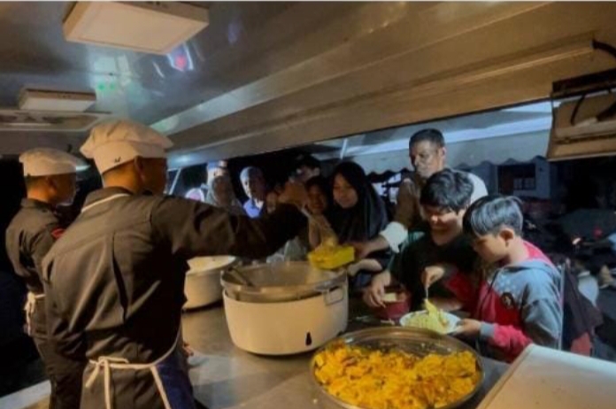 Sejak dibuka, mobil dapur lapangan tersebut langsung diserbu warga. Anak-anak, orang dewasa hingga lanjut usia tampak mengantre dengan tertib sambil membawa piring dan tempat makan. Mereka menerima paket nasi hangat lengkap dengan lauk mi instan dan telur, yang disajikan langsung dari Mobil Dapur Lapangan Brimob.