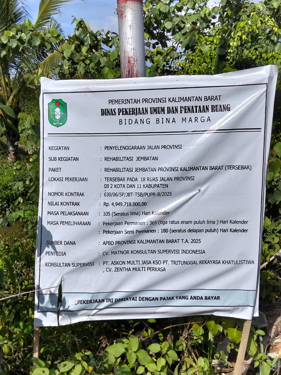 Proyek yang menelan anggaran RP. 4.949.718.000,00 bersumber APBD Provinsi Kalimantan Barat Tahun anggaran 2025 yang di kerjakan Cv. Matnor Konsultan Supervisi Indonesia dengan waktu pelaksana 105 hari kalender.
