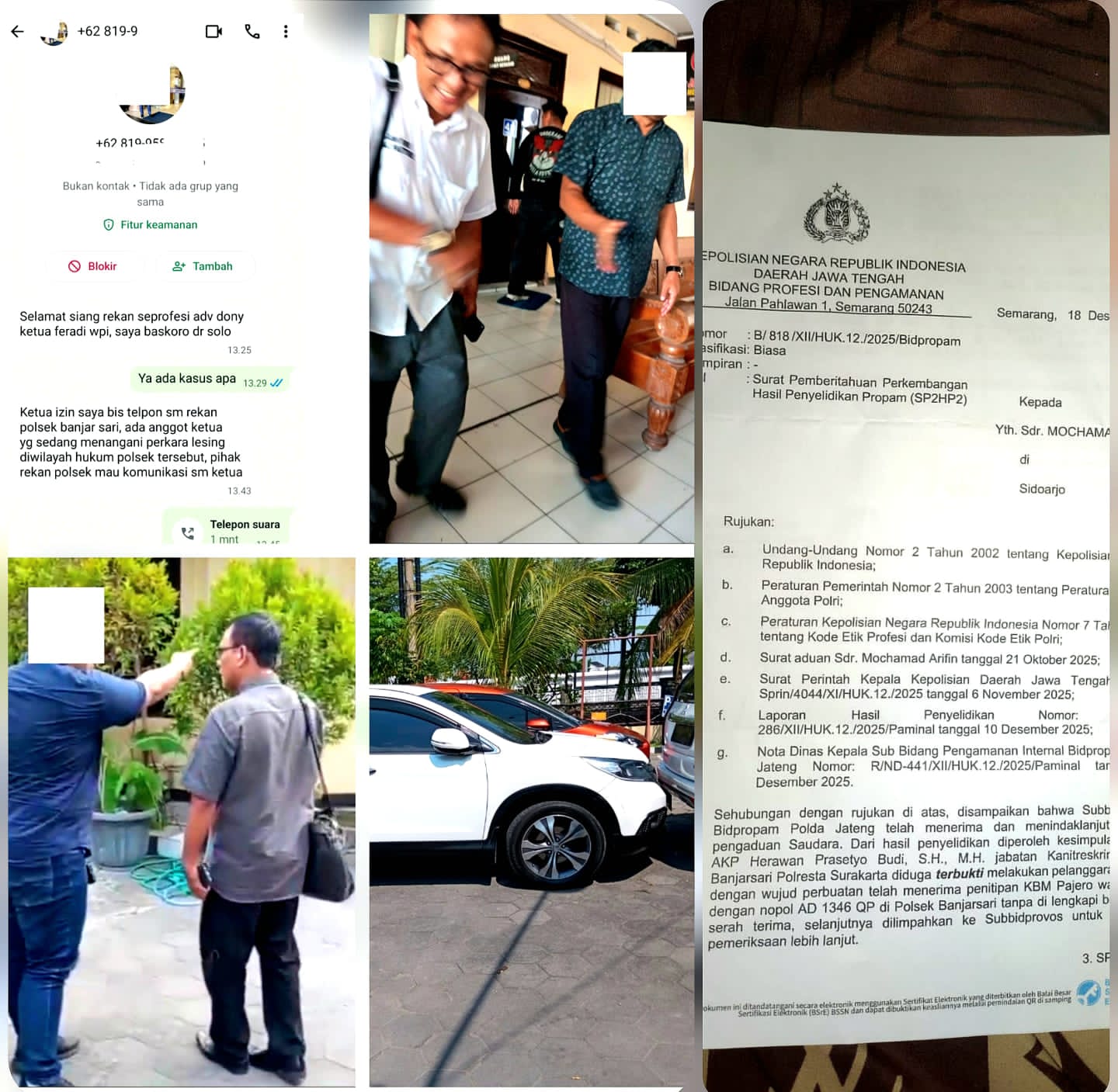 Tiba tiba Nomor Whatsapp Ketua Umum FERADI WPI Bapak Advokat Donny Andretti, S.H., S.Kom., M.Kom., C.Md., C.PFW., C.MDF., C.JKJ. yang merupakan Kuasa Hukum dari M. Arifin Pelapor Dalam Perkara Dugaan Oknum Kanit Reskrim Polsek Banjarsari Surakarta ( AKP H) yang diduga menjadi beking Oknum DC. Dimana perkaranya telah bergulir di PROPAM POLDA JATENG dan berdasarkan SP2HP2 dari Propam AKP H diduga dinyatakan terbukti Bersalah dan akan di proses lebih lanjut mendapat whatsapp chat dan telp dari orang tak dikenal. Dengan nomor wa oknum tersebut di “0819958XXXXX”