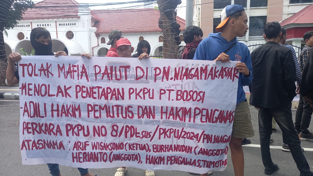 Cybertv.id – Makassar, Sulsel – Aksi Unjuk rasa yang dilakukan oleh Massa dari Rumah Pegiat Hukum dan Demokrasi didepan PN Makassar dengan Issue Tolak penetapan PKPU Sementara No.8/Pdt.Sus-PKPU/2024/PN Niaga Makassar pada Tanggal 17 Oktober 2024 yang mana keputusan tersebut dinilai cacat prosedur dalam proses penetapannya. Senin 16/12/2024.