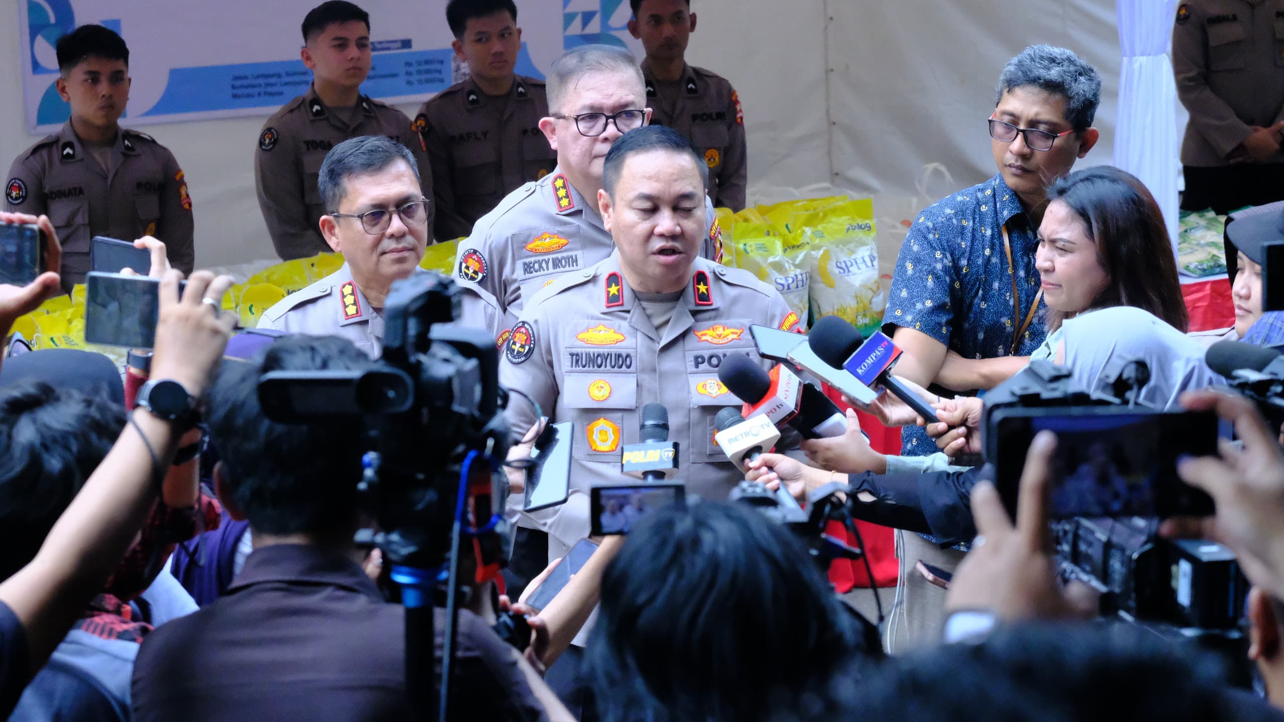 “Pada Gerakan Pangan Murah kali ini, kami menyediakan paket pangan murah yang berisi empat komoditas utama, yaitu beras 10 kg seharga Rp110.000, terigu Rp11.000, gula Rp17.500, dan minyak goreng Rp18.500. Jadi total paket hanya Rp157.000,” ujar Brigjen Pol Trunoyudo saat memberikan keterangan kepada media.
