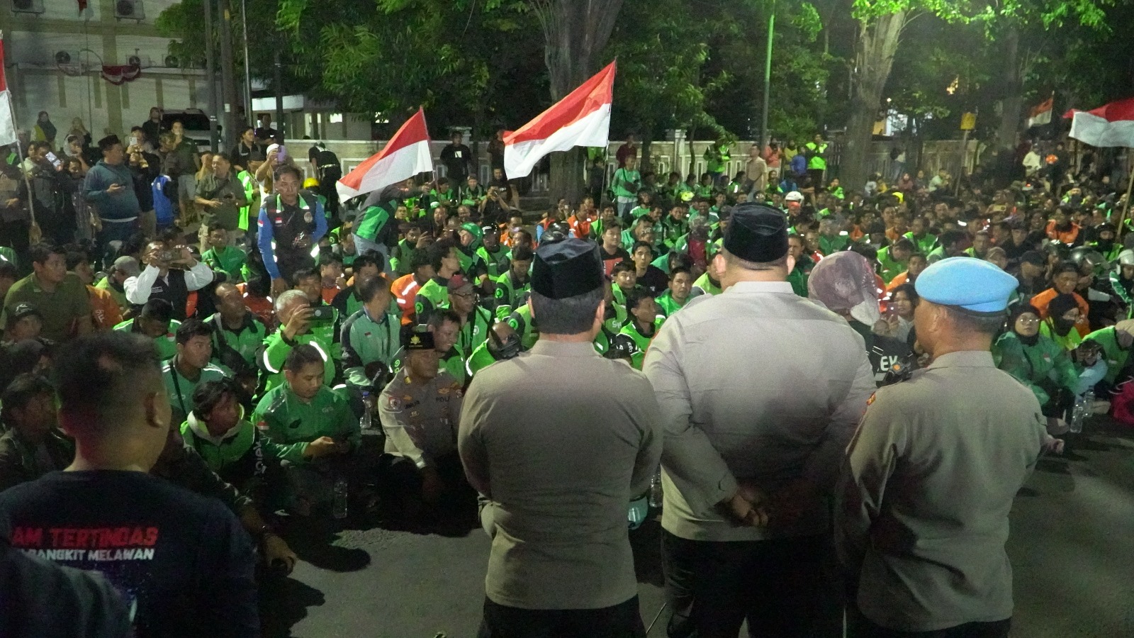“Malam hari ini kita melaksanakan aksi solidaritas terhadap rekan kita yang meninggal dunia. Saya harap seluruh peserta aksi untuk duduk, jangan ada yang berdiri guna menghindari provokasi. Kegiatan kita kemas dalam bentuk doa bersama, shalat gaib,” jelasnya.