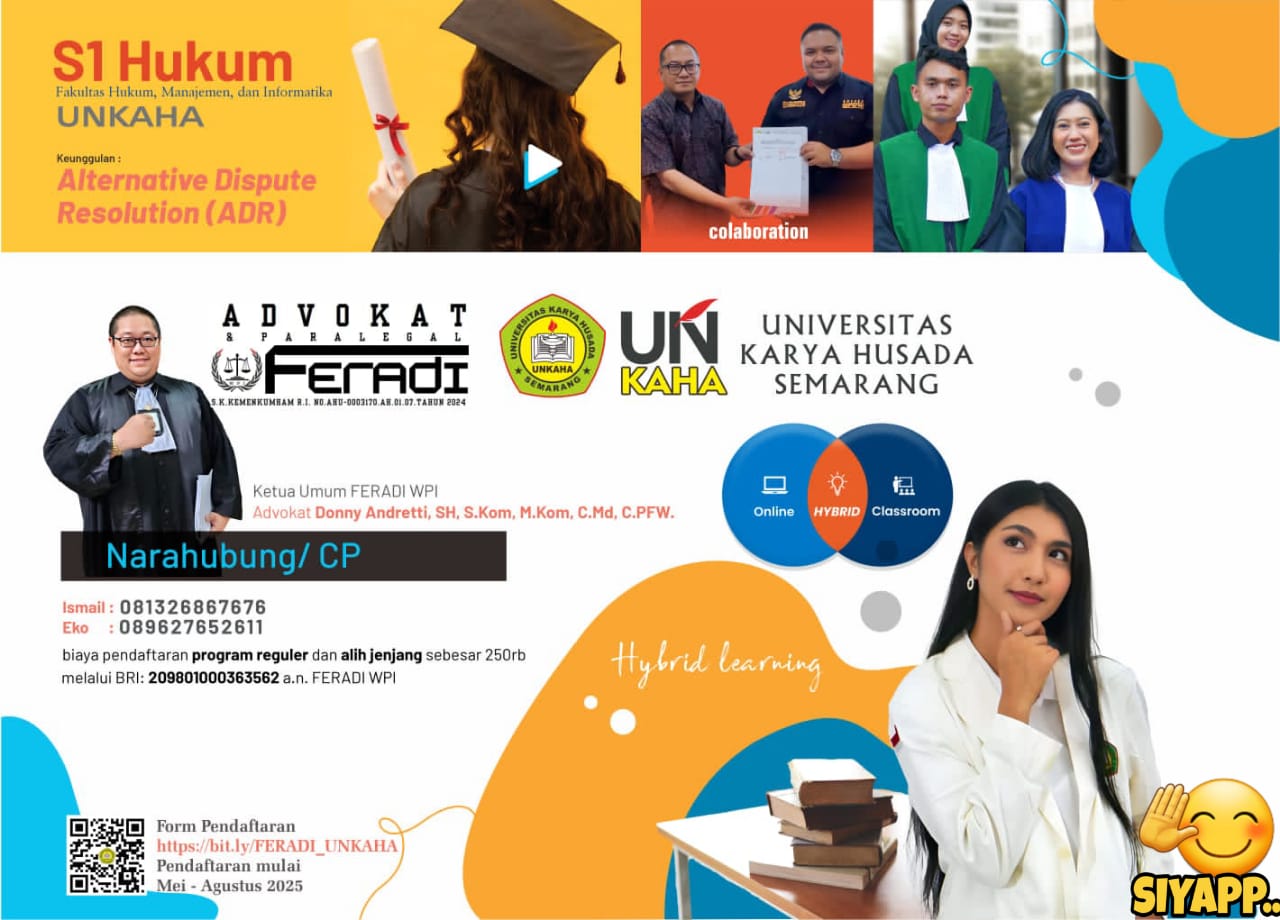 Program ini adalah bagian dari ikhtiar menciptakan masyarakat hukum yang sadar, aktif, dan mampu membela kepentingan publik secara profesional. FERADI WPI dan UNKAHA membuka jalan bagi Anda yang ingin membangun masa depan sebagai sarjana hukum sekaligus praktisi yang peduli terhadap keadilan dan integritas bangsa.