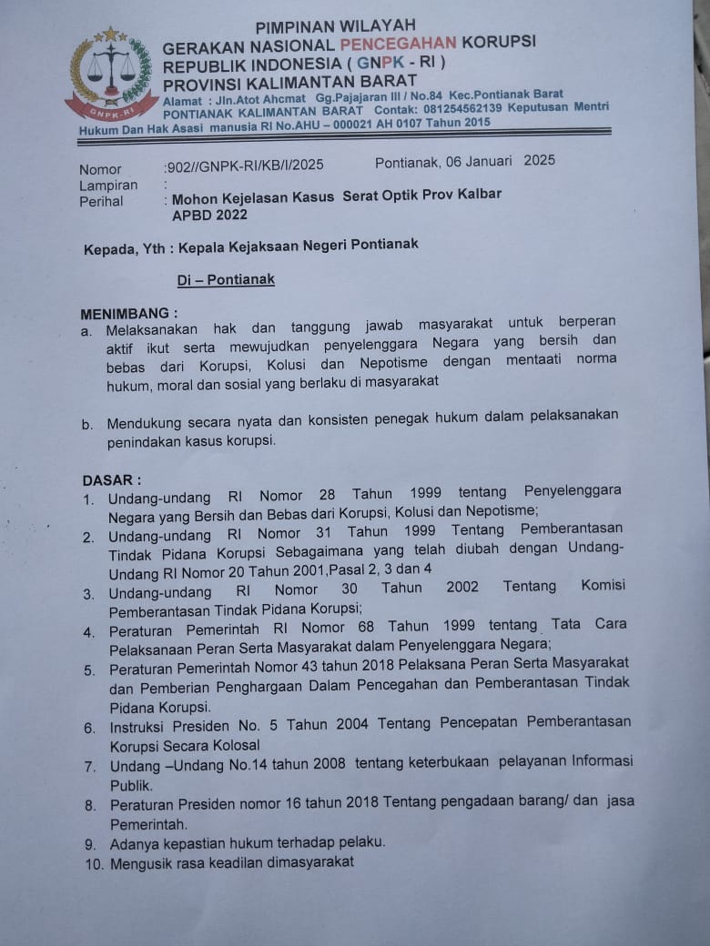Gerakan Nasional Pencegahan Korupsi Republik Indonesia (GNPK RI) wilayah Kalimantan Barat melayangkan surat kedua pada Senin (6/1/2025) untuk mempertanyakan langkah Kejari.