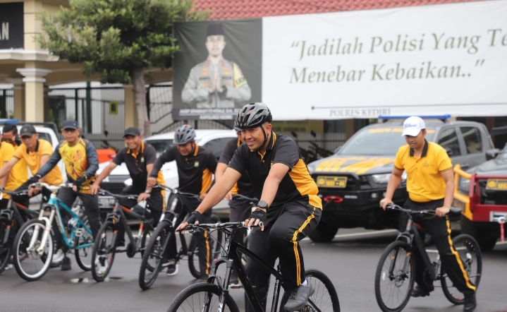 Kapolres Kediri AKBP Bramastyo Priaji, S.H., S.I.K., M.Si., bersama jajaran personel Polres Kediri mengikuti kegiatan olahraga gowes dengan rute datar (flat) mengelilingi kawasan tersebut.
