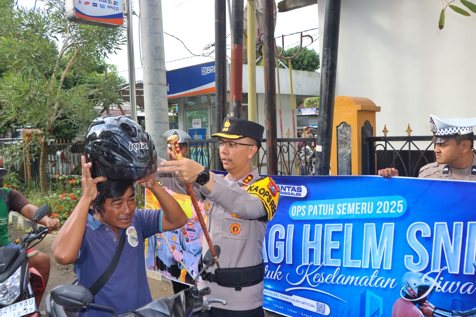 Aksi bagi-bagi helm gratis dipimpin langsung Kapolres Trenggalek AKBP Ridwan Maliki di jalan raya Brigjen Soetran pada Senin (14/7/2025).