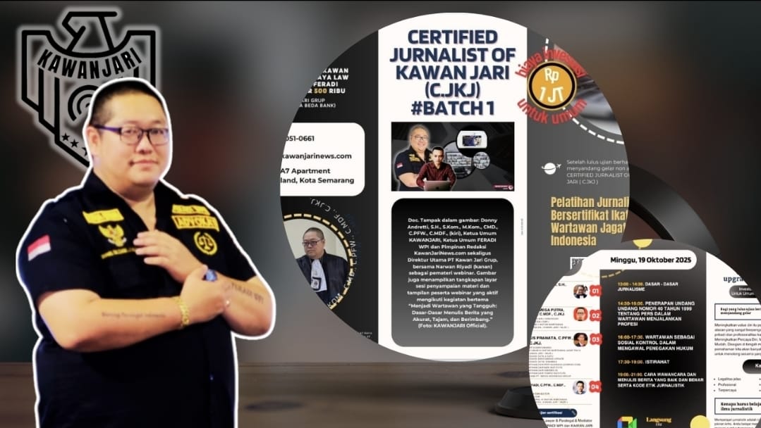 Cybertv.id – Semarang, Minggu, 19 Oktober 2025 — Ikatan Wartawan Jagat Raya Indonesia (IWJRI / KAWAN JARI) bersama PT Kawan Jari Grup menggelar Pelatihan Wartawan Bersertifikat Profesional melalui program Certified Journalist of Kawan Jari (CJKJ) Batch 1, yang dilaksanakan secara daring melalui Google Meet. Kegiatan ini diikuti oleh peserta dari berbagai wilayah Indonesia dengan tujuan meningkatkan kompetensi, integritas, dan profesionalisme wartawan di era digital.