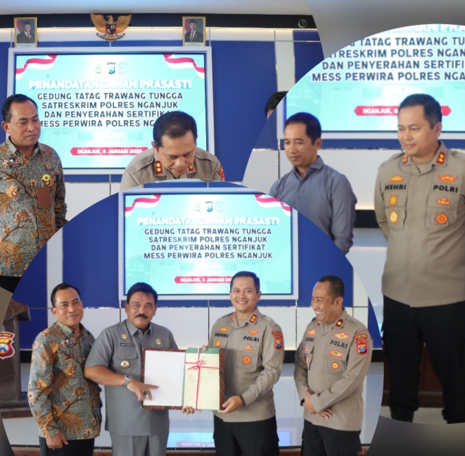 Cybertv.id-Nganjuk – Kapolres Nganjuk AKBP Henri Noveri Santoso, S.H., S.I.K., M.M., meresmikan Gedung Tatag Trawang Tungga Satreskrim Polres Nganjuk sekaligus melaksanakan penandatanganan prasasti dan penyerahan Sertifikat Hak Milik (SHM) Mess Perwira Polres Nganjuk, bertempat di Aula Tantya Sudhirajati Polres Nganjuk, Kamis (08/01/2026).