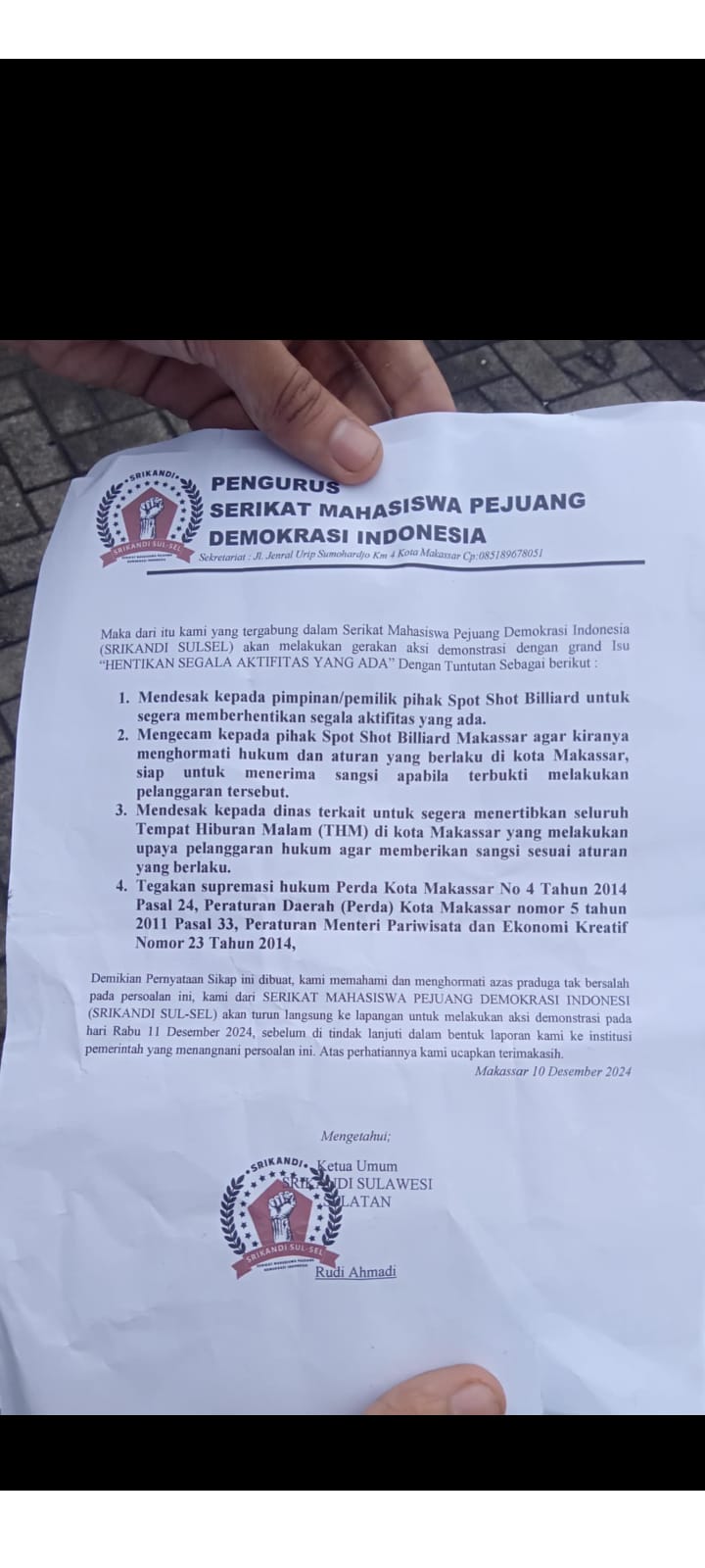 Cybertv.id – Makassar – Serikat Mahasiswa Pejuang Demokrasi Indonesia (Srikandi Sulsel) menggelar aksi demonstrasi di depan Stadium Billiard dan Cafe di Jalan Perintis Kemerdekaan, Kamis (12/12/2024). Mereka menuntut penutupan usaha tersebut atas dugaan pelanggaran Peraturan Daerah (Perda) Kota Makassar, termasuk beroperasi di luar jam operasional yang diizinkan dan tidak memiliki surat izin usaha.