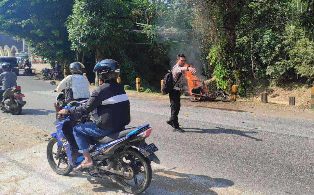 Menurut keterangan di lokasi, motor Revo yang dikendarai seorang warga pria dewasa mendadak mengeluarkan asap tebal dari bagian mesin. Tak lama kemudian, api mulai membakar bagian belakang kendaraan. Menyadari kondisi tersebut, pengendara langsung menepi dan menjauh demi keselamatan.