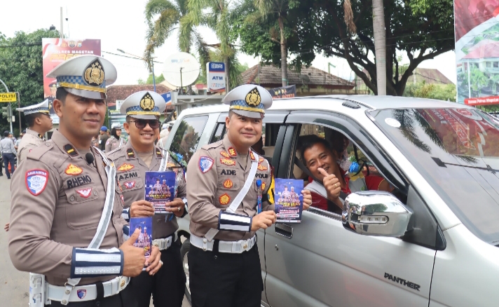 Melalui kegiatan Polantas Menyapa Masyarakat, petugas dari Satlantas Polres Magetan itu turun ke jalan Raya depan Mapolres Magetan dengan membagikan pamflet, bunga hingga kue Coklat kepada pengendara yang melintas.