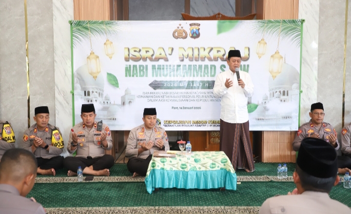 Sementara Kapolres Kediri menyampaikan bahwa peringatan Isra’ Mi’raj menjadi pengingat penting bagi seluruh personel Polri untuk terus menjaga keseimbangan antara profesionalitas dan spiritualitas.