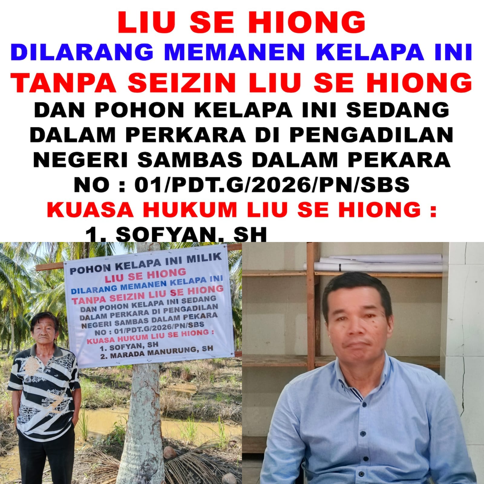 cybertv.id – Pontianak – Kuasa hukum Liu Se Hiong menyampaikan pemberitahuan kepada aparat penegak hukum serta instansi terkait menyusul adanya sengketa hukum terkait kepemilikan dan ganti rugi tanam tumbuh berupa pohon kelapa yang saat ini masih dalam proses perkara perdata di pengadilan.Perkara tersebut tercatat dengan Nomor: 01/Pdt.G/2026/PN.SBS, yang melibatkan Liu Se Hiong selaku Penggugat dan Mu’in selaku Tergugat.