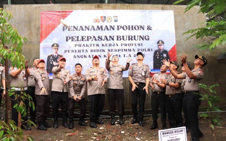 Selain menanam puluhan bibit pohon di sekitar area Mapolres Malang, para peserta juga melakukan pelepasan 75 ekor burung.