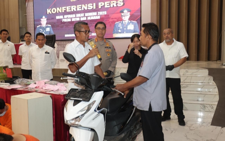 Cybertv.id-SURABAYA – Direktorat Reserse Kriminal Umum (Ditreskrimum) Polda Jawa Timur menyerahkan kembali satu unit sepeda motor Honda Beat hasil pengungkapan kasus pencurian kendaraan bermotor dalam Operasi Sikat Semeru 2025.
