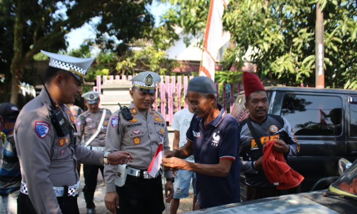 Polisi Gelorakan Semangat Nasionalisme Ratusan Bendera Merah Putih Dibagikan untuk Pengemudi di Bondowoso