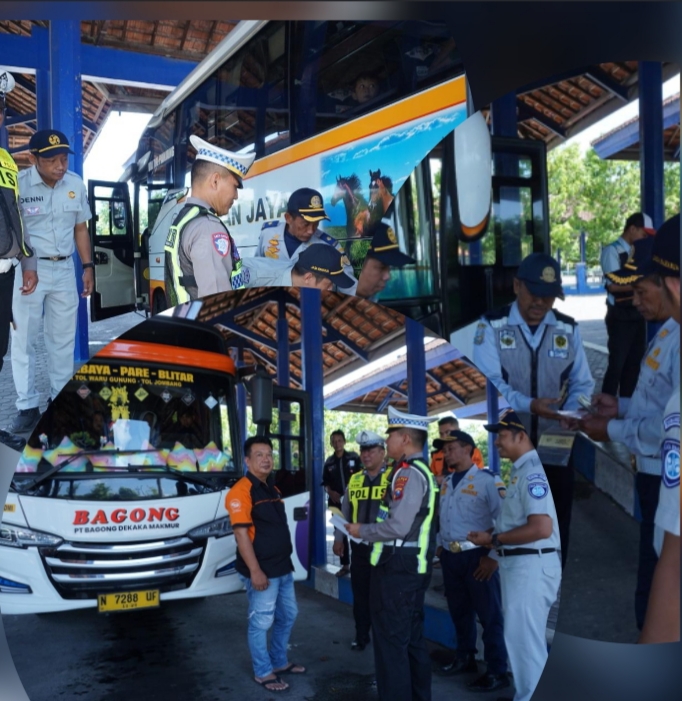 Cybertv.id-KEDIRI – Menyambut momen libur Tahun Baru 2026, Satlantas Polres Kediri bersama UPT Dinas Perhubungan Kediri dan Jasa Raharja Kediri melakukan inspeksi keselamatan kendaraan umum dan bus di Terminal Pare, Selasa (30/12/2025).