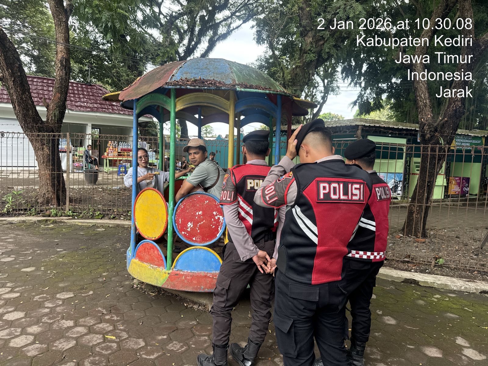 Jumat (2/1/2026), personel Satsamapta Polres Kediri melaksanakan patroli dialogis di beberapa titik destinasi wisata untuk memastikan situasi kamtibmas tetap aman dan terkendali.