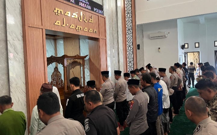 Cybertv.id-KEDIRI– Jajaran Polres Kediri bersama masyarakat menggelar salat gaib dan do’a bersama usai salat Jumat di Masjid Al-Aman, Mapolres Kediri, Jumat (29/8/2025).