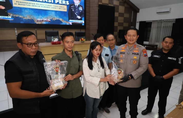Cybertv.id-MAGETAN – Kurang dari 24 jam, jajaran kepolisian Resor Magetan Polda Jatim berhasil mengungkap dan mengamankan terduga pelaku pembobolan toko emas yang terjadi di wilayah Kecamatan Bendo, Kabupaten Magetan.