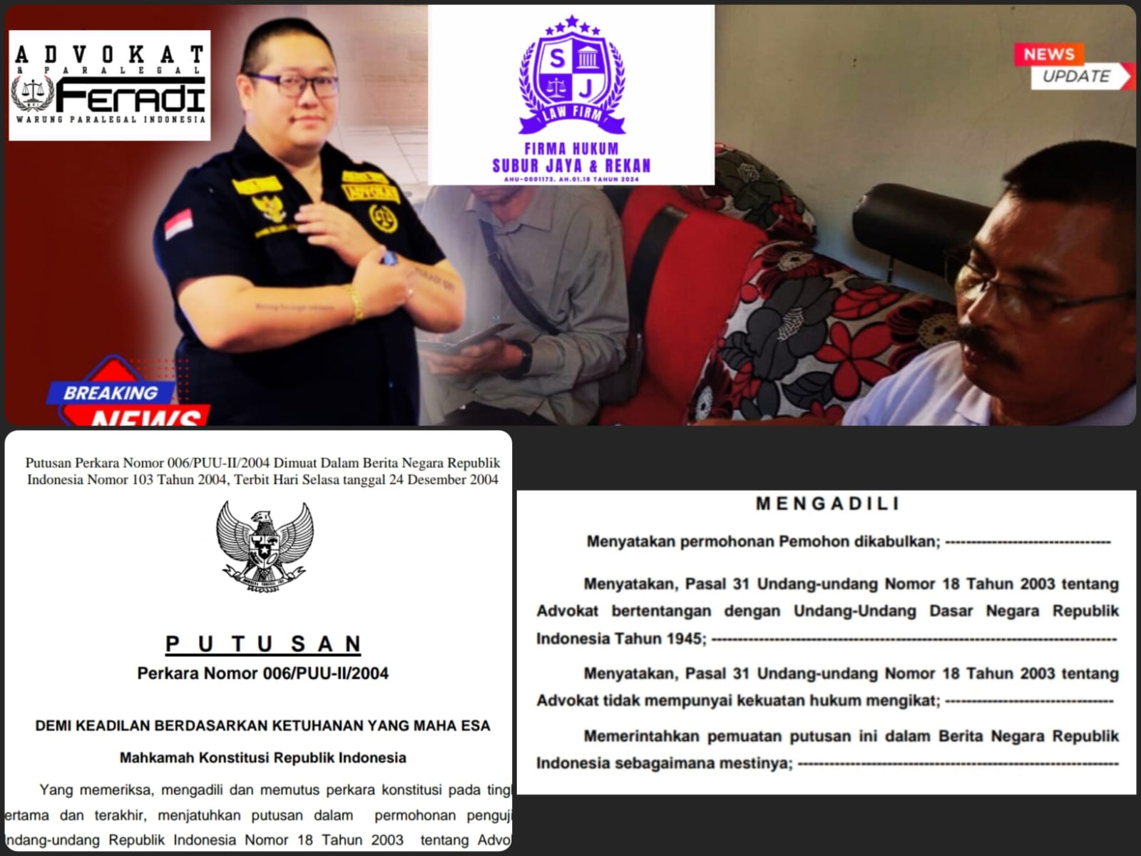 Ia menjelaskan, Mahkamah Konstitusi membatalkan Pasal 31 Undang-Undang Nomor 18 Tahun 2003 tentang Advokat karena dinilai bertentangan dengan UUD 1945, khususnya Pasal 28F tentang hak setiap orang untuk memperoleh dan menyampaikan informasi, termasuk informasi hukum. MK berpendapat bahwa pasal tersebut berpotensi menghambat kiprah lembaga bantuan hukum (LBH) kampus dalam memberikan pelayanan hukum kepada rakyat miskin, serta menimbulkan ketidakpastian hukum bagi masyarakat yang hanya ingin memperoleh penjelasan hukum dari pihak non-advokat.