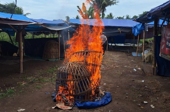 Sebagai langkah antisipasi dan bentuk peringatan, petugas kemudian melakukan pemusnahan terhadap fasilitas yang diduga digunakan untuk aktivitas judi sabung ayam, berupa kurungan ayam, terpal, dan karpet, dengan cara dibakar di lokasi.