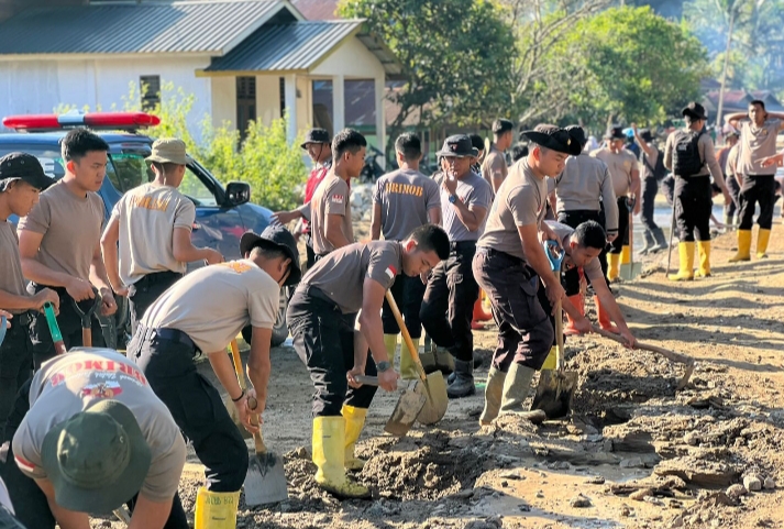 Polri Bersihkan Area Terdampak Banjir Bandang di Kampung Tengah Kecamatan Palembayan Agam Sumbar