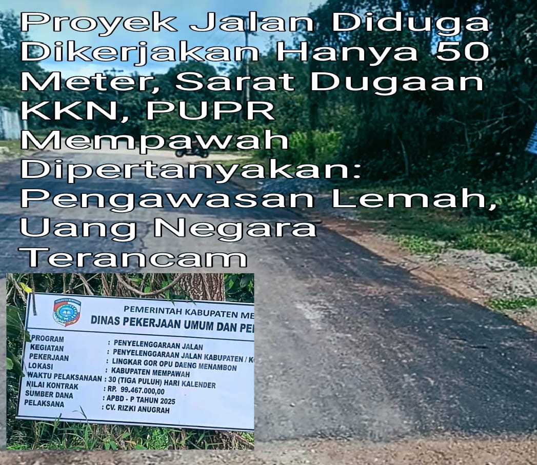 Proyek yang bersumber dari APBD Perubahan Tahun Anggaran 2025 tersebut diduga tidak dikerjakan sesuai kontrak, bahkan hanya terealisasi sekitar ±50 meter, jauh dari kewajaran sebuah pekerjaan jalan.