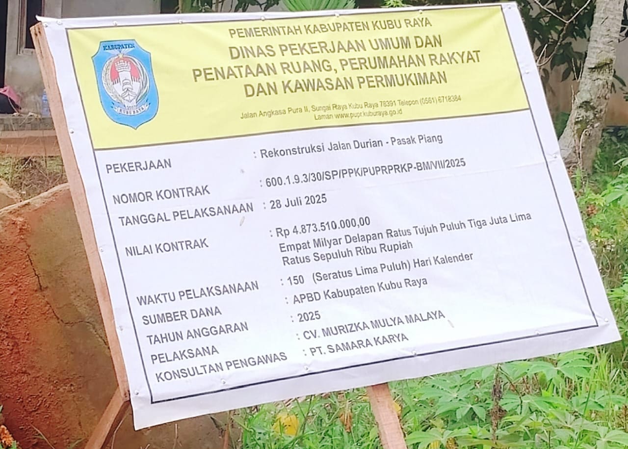 Proyek Rekonstruksi Jalan Durian–Pasak piang yang dibiayai dari APBD Kabupaten Kubu Raya Tahun Anggaran 2025 senilai Rp 4.873.510.000,00 diduga tidak dikerjakan sesuai standar dan spesifikasi teknis konstruksi. Temuan tim investigasi media menemukan keretakan pada banyak titik lokasi pekerjaan, yang kemudian ditutupi dengan ter aspal hitam tanpa melalui proses perbaikan struktural.