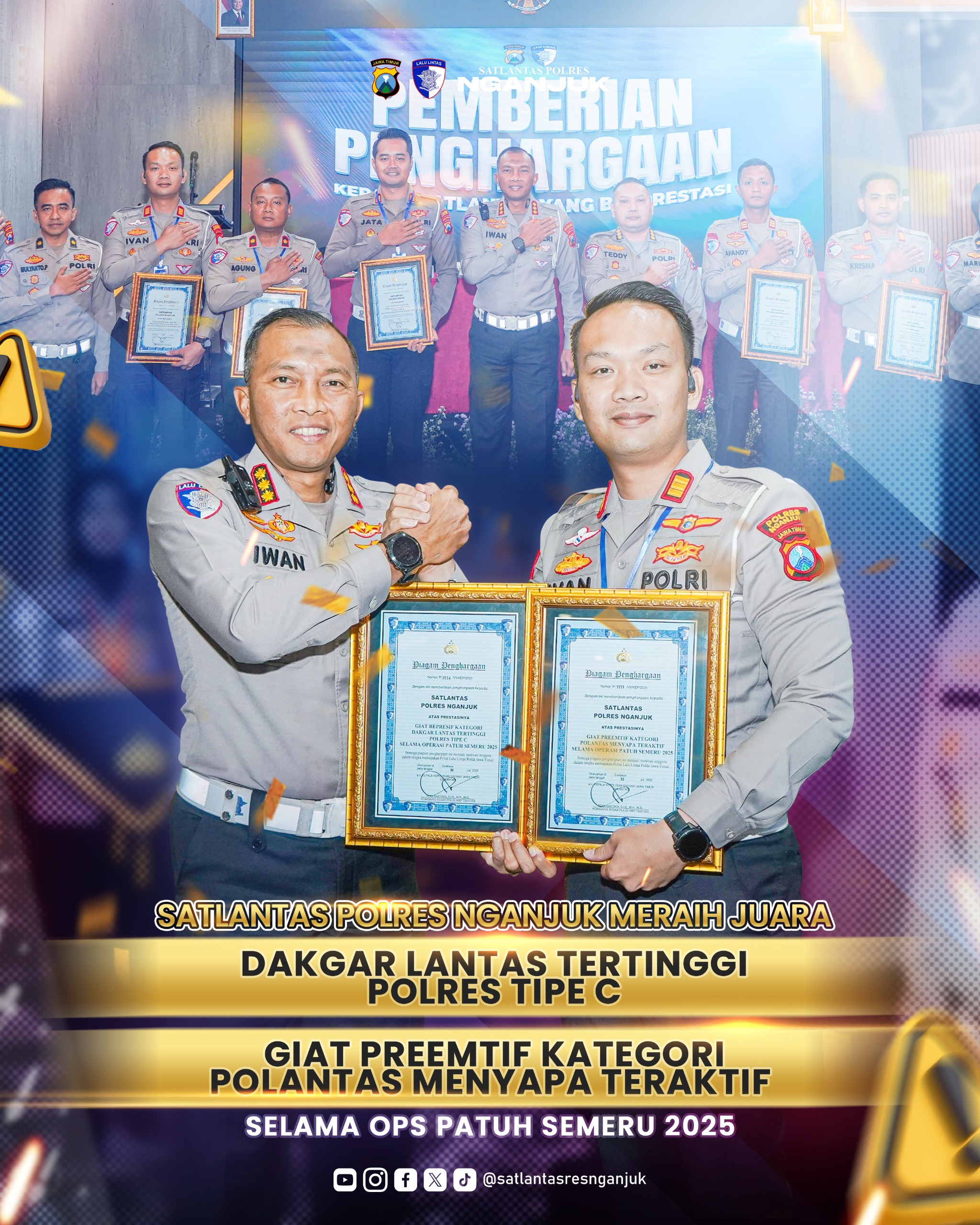 Penghargaan tersebut diserahkan langsung oleh Dirlantas Polda Jatim, Kombes Pol Iwan Saktiadi, S.I.K., M.H., M.Si., sebagai bentuk apresiasi atas kinerja luar biasa Satlantas Polres Nganjuk selama pelaksanaan Operasi Patuh Semeru 2025 dan Operasi Lilin Semeru 2024.