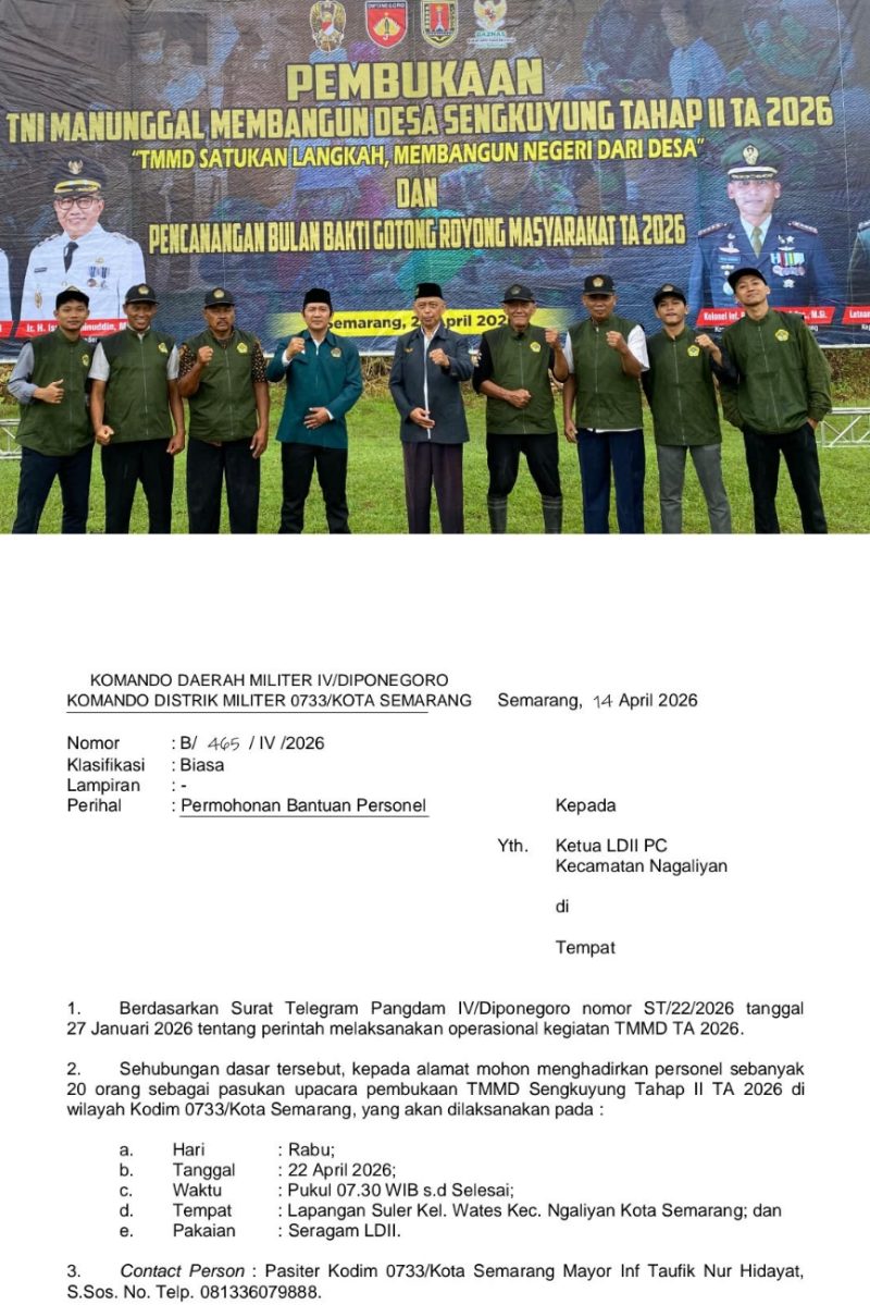 Permohonan dukungan tersebut disampaikan melalui surat resmi tertanggal 14 April 2026. Dalam surat itu, Kodim 0733 meminta kehadiran 20 personel LDII untuk mengikuti upacara pembukaan TMMD.