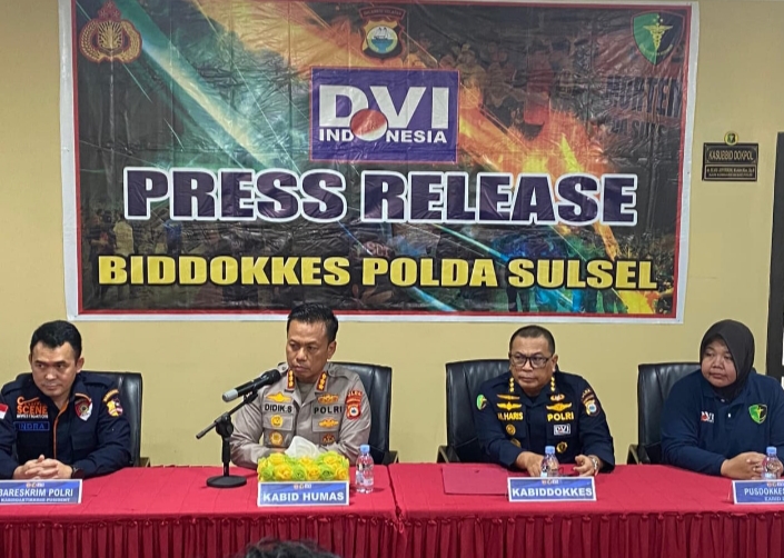 Konferensi Pers tersebut dipimpin langsung oleh Kabid Humas Polda Sulsel Kombes Pol. Didik Supranoto, S.I.K., M.H., didampingi Kabiddokkes Polda Sulsel, perwakilan Pusdokkes Polri selaku Kabid DVI, serta perwakilan Bareskrim Polri melalui Kabiddaktikkrim Pusident.