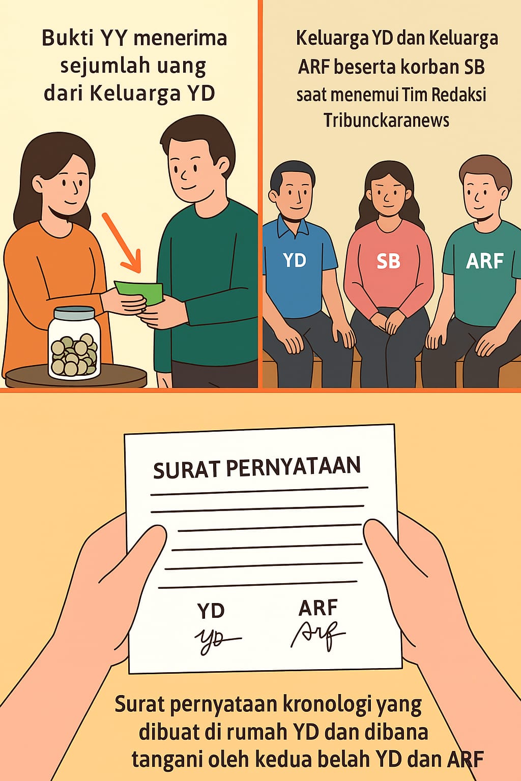 Hasil investigasi lapangan tersebut kemudian dituangkan dalam bentuk surat pernyataan resmi yang ditandatangani di atas materai oleh keluarga YD maupun ARF. Dokumen otentik ini menjadi dasar yang kuat dan sahih bagi kami dalam mempublikasikan berita.