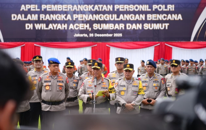 Cybertv.id-Jakarta – Wakapolri Komjen Pol Prof. Dr. Dedi Prasetyo menegaskan komitmen Polri untuk terus hadir di tengah masyarakat melalui apel pemberangkatan personel Polri dalam rangka penanggulangan bencana di Aceh, Sumatera Utara, dan Sumatera Barat. Apel digelar di Lapangan Bhayangkara Mabes Polri, Jumat (26/12/2025).