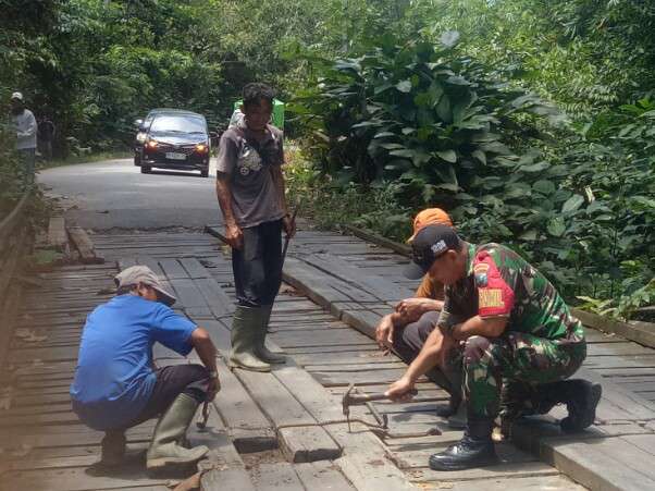 Kepedulian dan partisipasi Personil TNI Koramil 1206-16 Seberuan mendorong perbaikan jembatan yang rusak,tepatnya dijalan lintas Desa Rinyai Kecamatan Seberuang Kabupaten Kapuas Hulu, Senin 22/9/2025.