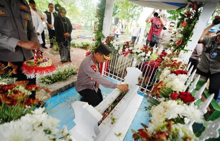 Cybertv.id-Jatim – Kapolri Jenderal Listyo Sigit Prabowo berziarah ke makam Pahlawan Nasional Marsinah di Kecamatan Sukamoro, Kabupaten Nganjuk, Jawa Timur (Jatim). Ia juga melihat rumah masa kecil dari tokoh buruh tersebut.